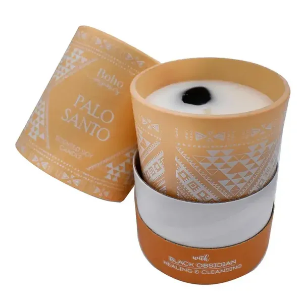 Soja kaars palo santo met zwarte obsidiaan edelsteen - helend en reinigend Gemaakt met gifvrije natuurlijke sojawas Doordrenkt met prachtige geurige essentiële oliën Palo Santo wordt al eeuwenlang gebruikt in sjamanistische ceremonies en genezingsrituelen.