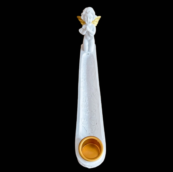 Deze prachtige houder is gemaakt van duurzaam hars en is versierd met een elegant engelenfiguurtje. Perfect voor wierookstokjes, verspreidt hij een heerlijke geur terwijl hij je interieur een spiritueel en vredig accent geeft.