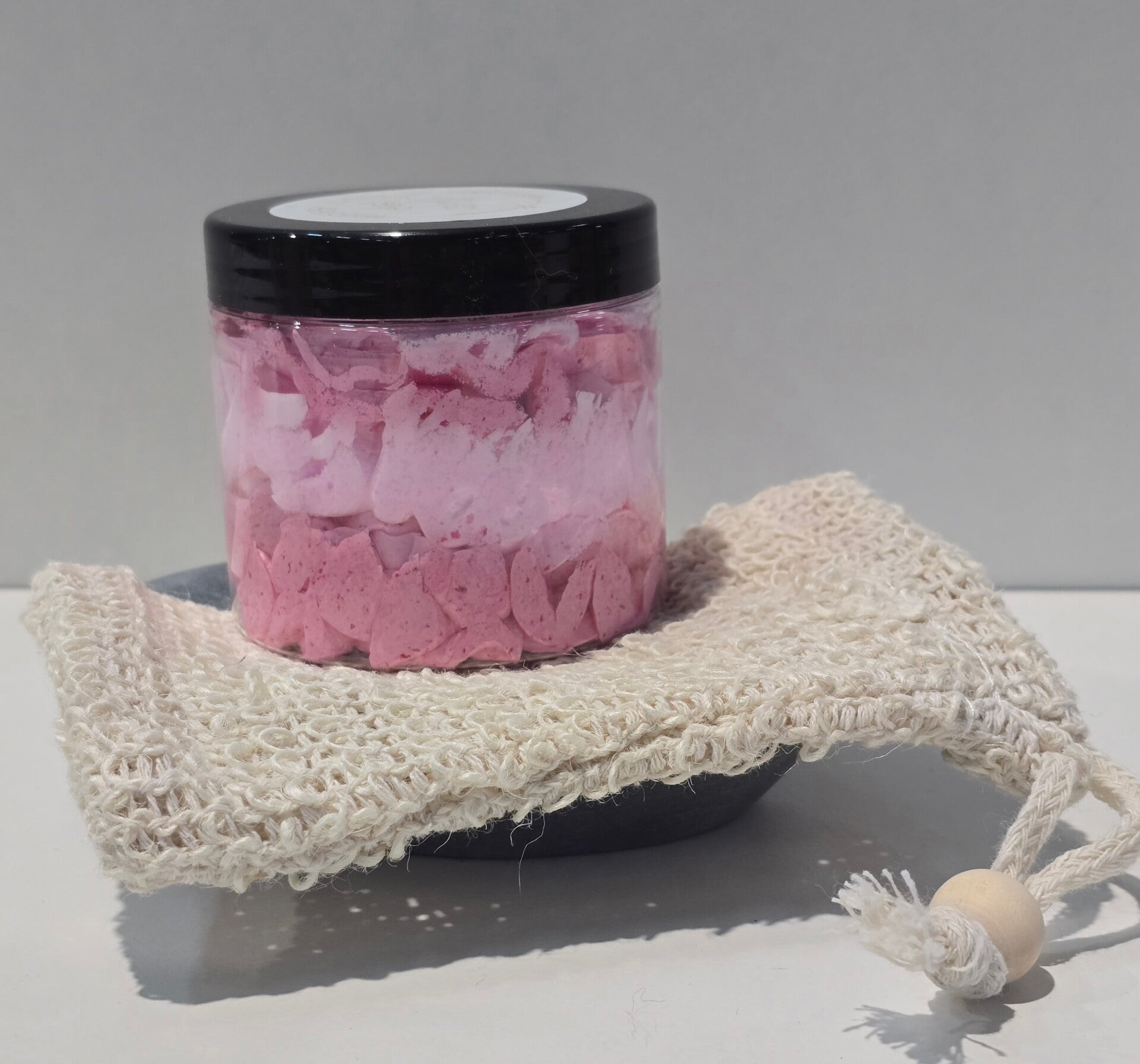 Voor een extra verwenmoment kun je onze opgeklopte zeep gebruiken met een douchepuff. Door zachtjes met de puff over de zeep te wrijven, krijg je nog meer schuim, zodat je kunt genieten van een luxe en ontspannende douche of bad.